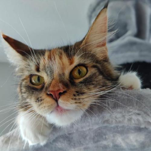 Sinds 12 september 2021 woont Lady bij ons. Ze is onze eerste Maine Coon. In het begin verstopte ze zich als ze ons niet zag. Toen Missy een paar dagen later ook bij ons kwam wonen was dit over. Ze is helemaal op haar gemak en het liefst altijd bij ons in de buurt. Ze heeft een lief karakter en kan op haar manier hele gesprekken met ons voeren.